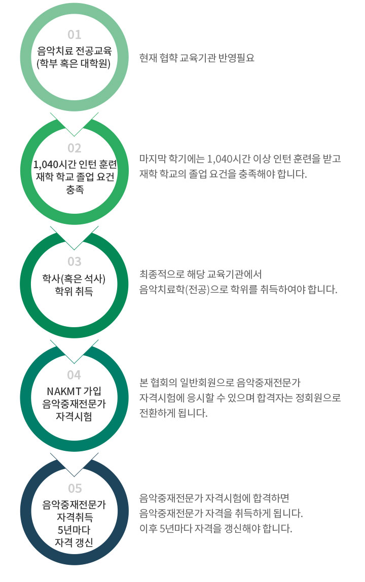 이에 2007년 음악치료학과(전공)가 있는 전국 대학교 연합으로 사단법인 전국음악치료사협회(NAKMT)가 설립되면서 음악중재전문가 자격증을 비롯한 다양한 음악치료에 관한 업무가 통합되었습니다. 이후 (사)전국음악치료사협회(NAKMT)는 한국직업능력개발원에 민간자격(음악중재전문가 KCMT; KOREAN CERTIFIED MUSIC THERAPIST)으로 등록(등록번호 2011-0565)되었으며, 17개 협력 교육기관(2014년 현재)에서 양성된 예비 음악치료사들이 본 협회 주관 자격시험을 통해 매년 전문 음악치료사 (음악중재전문가 KCMT)로 배출되고 있습니다.